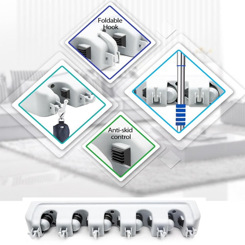 4 position and 5 Hooks holder Use in the laundry, garage, garden, utility room, office and more Wall organizer holds household stick goods with handles of varying thicknesses Insert handle into slot and the gravity controlled rolling ball automatically ajusts to the handle's thickness and holds it securely.
