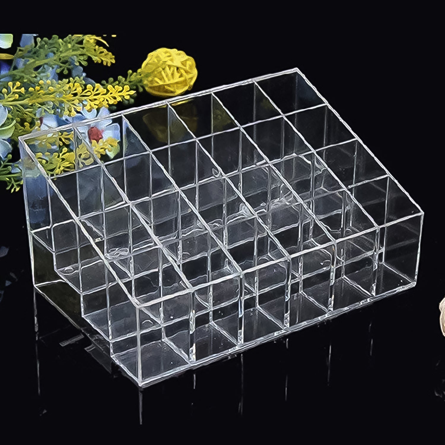 • Save your time and effort by keeping everything in one place with this great clear acrylic cosmetic stand. The top stand has been divided into 24 versatile compartments ideal for brushes, creams and lipsticks.
