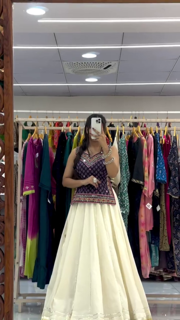 Elegant Mirror Work Crop Top with Flowy Cream Lehenga – Ideal for Festive & Wedding Celebrations