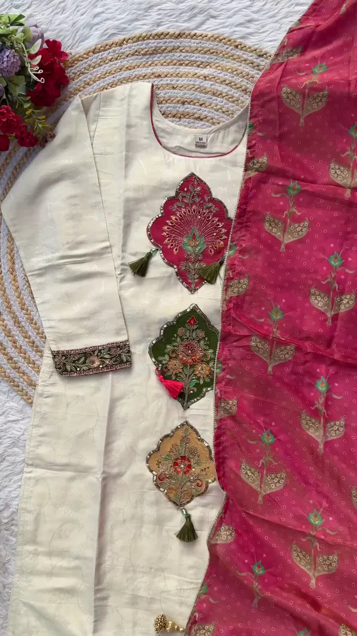 Dupatta: A rich pink dupatta with beautiful gold print, offering a vibrant contrast to the dress