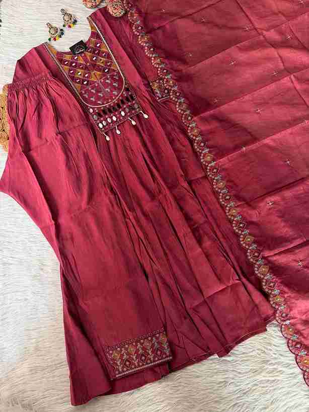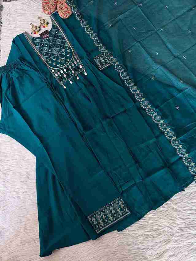 Intricate Embroidery: Features detailed mirror work and thread designs on the neckline and front panel.