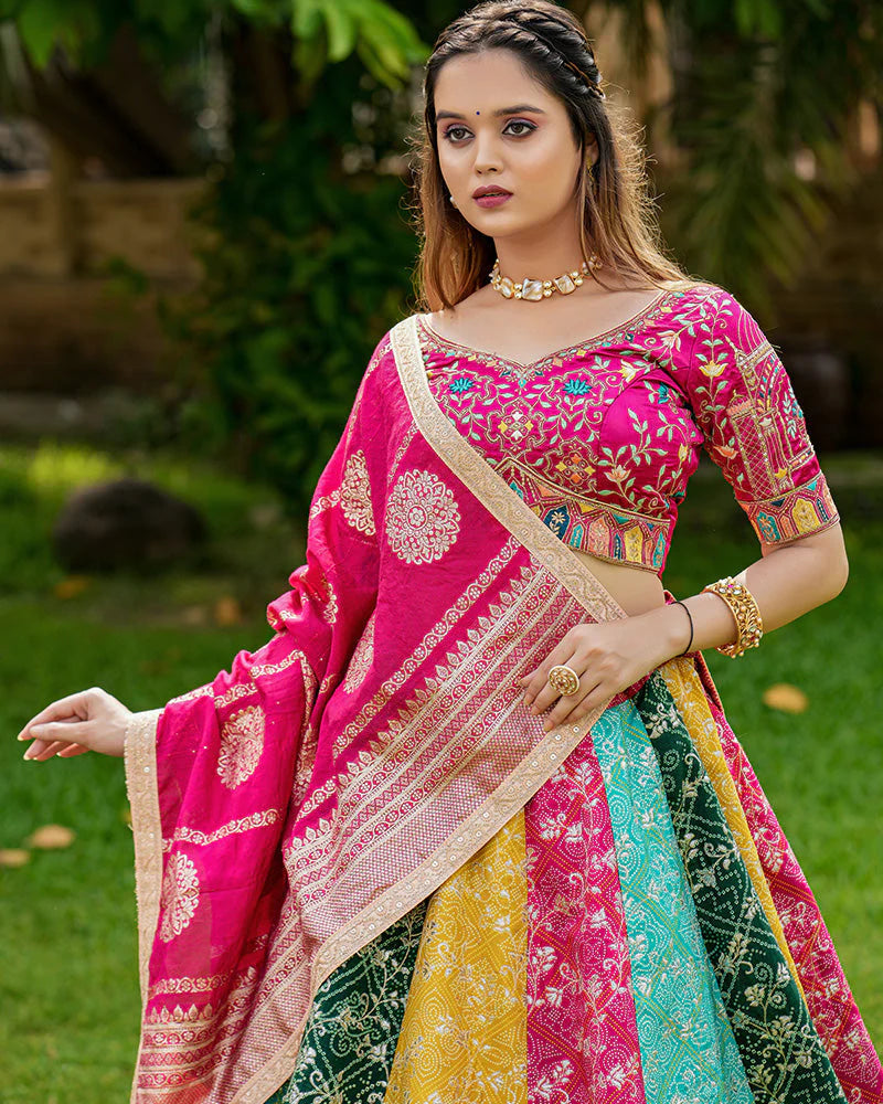 Embrace a kaleidoscope of colors and elegance with this Multi Color Embroidered Satin Silk Lehenga Choli. Crafted from luxurious satin silk, this ensemble promises both opulence and comfort. Adorned with intricate embroidery in a myriad of hues, it exudes vibrant charm and sophistication. Perfect for those who seek to captivate with grace and style at any special occasion or event.