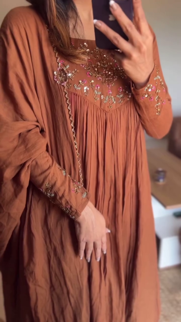 This is a stunning brown kurta with delicate embroidery around the neckline and sleeves. The outfit’s flowy silhouette paired with the graceful pleats