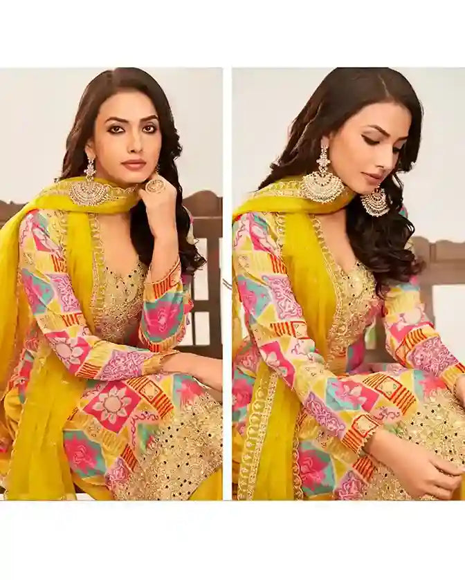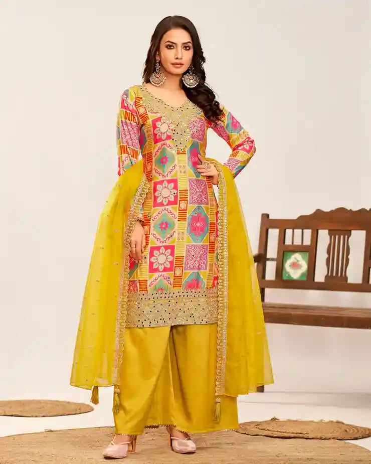 Yellow Women Readymade Chinnon Silk Zari Mirror Work Printed Palazzo Suit With Organza Silk Dupatta